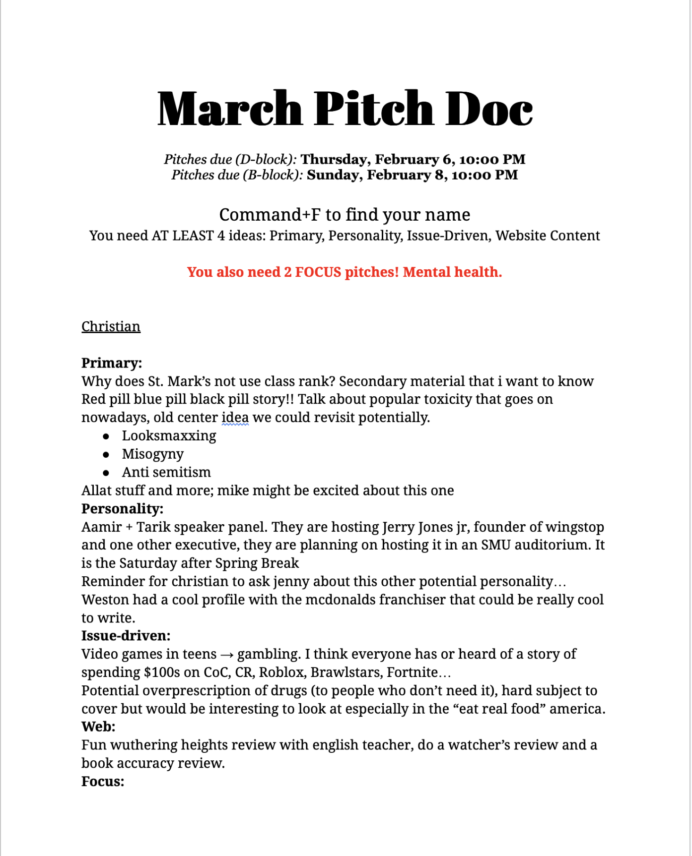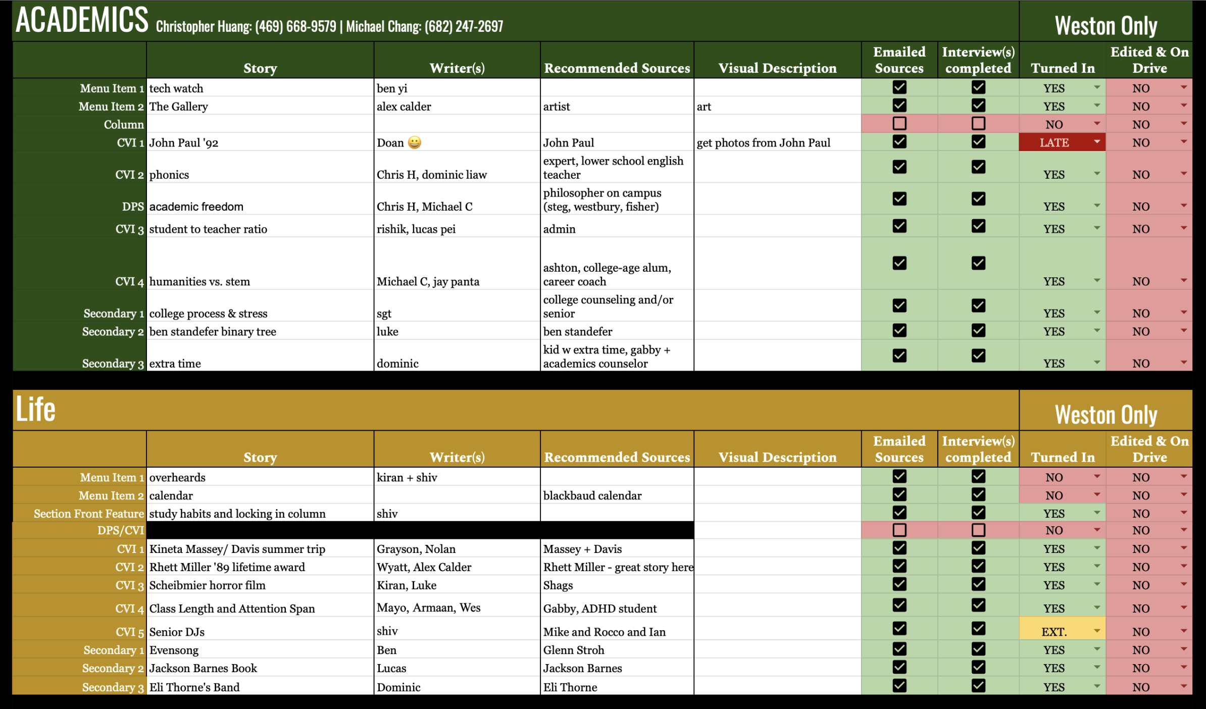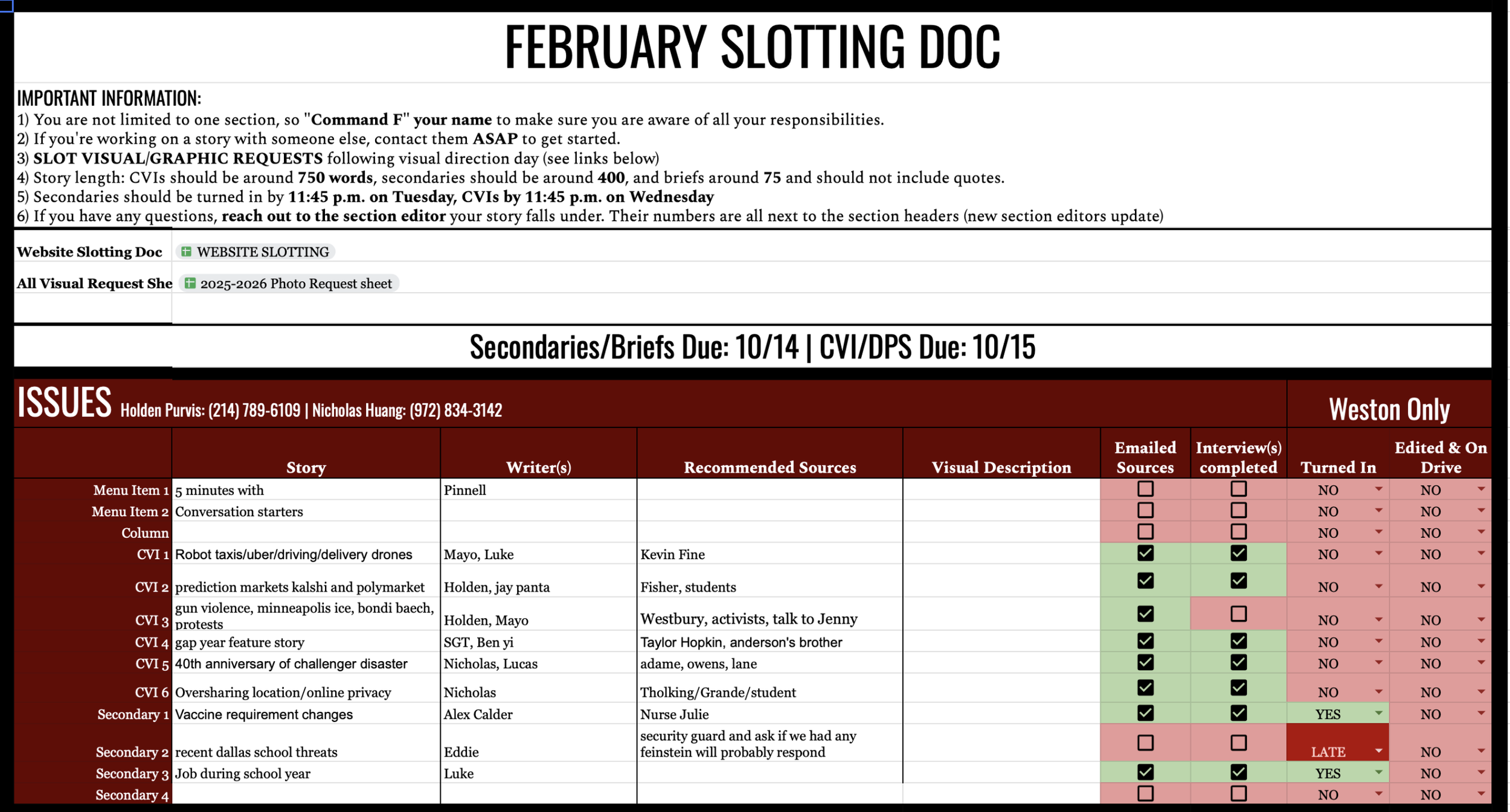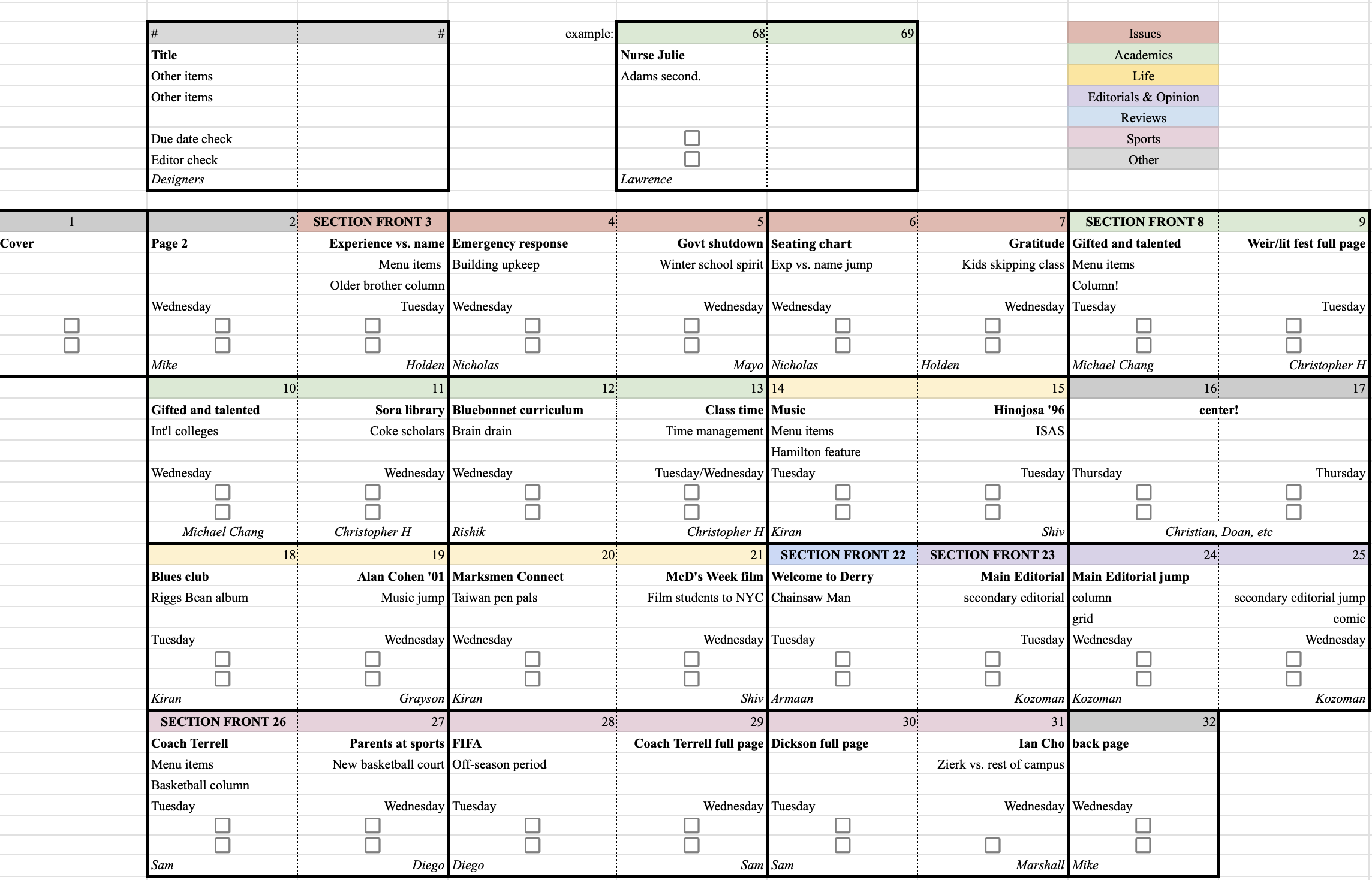 We use a variety of shared documents to keep our staff organized. Every cycle, we start off with a pitch day (pictured on the left), and the best of those 100s of story ideas get slotted into the slotting docs (pictured on the right). Finally, we wrap up the cycle with our production calendar (middle) to assign page design responsibilities.